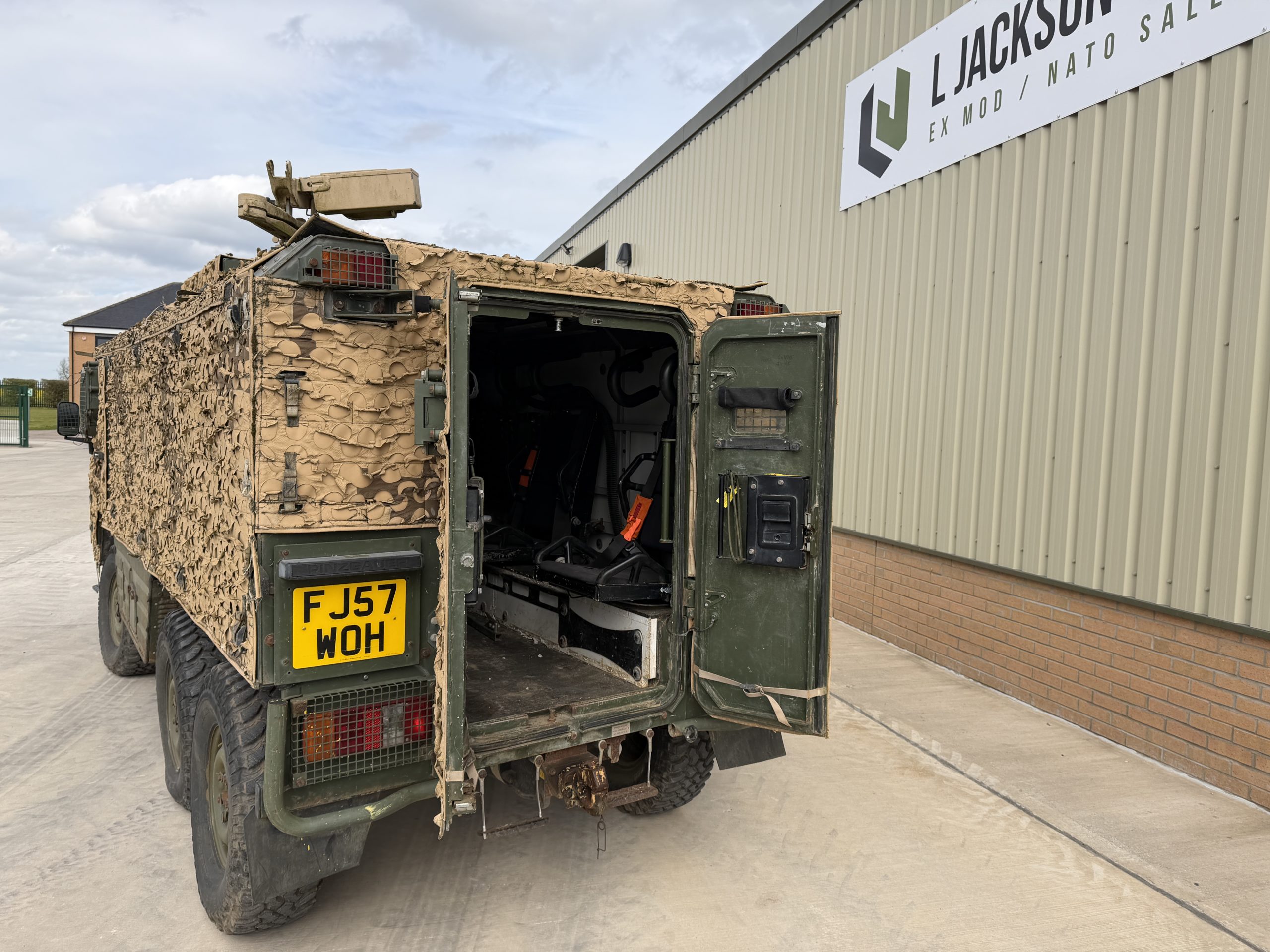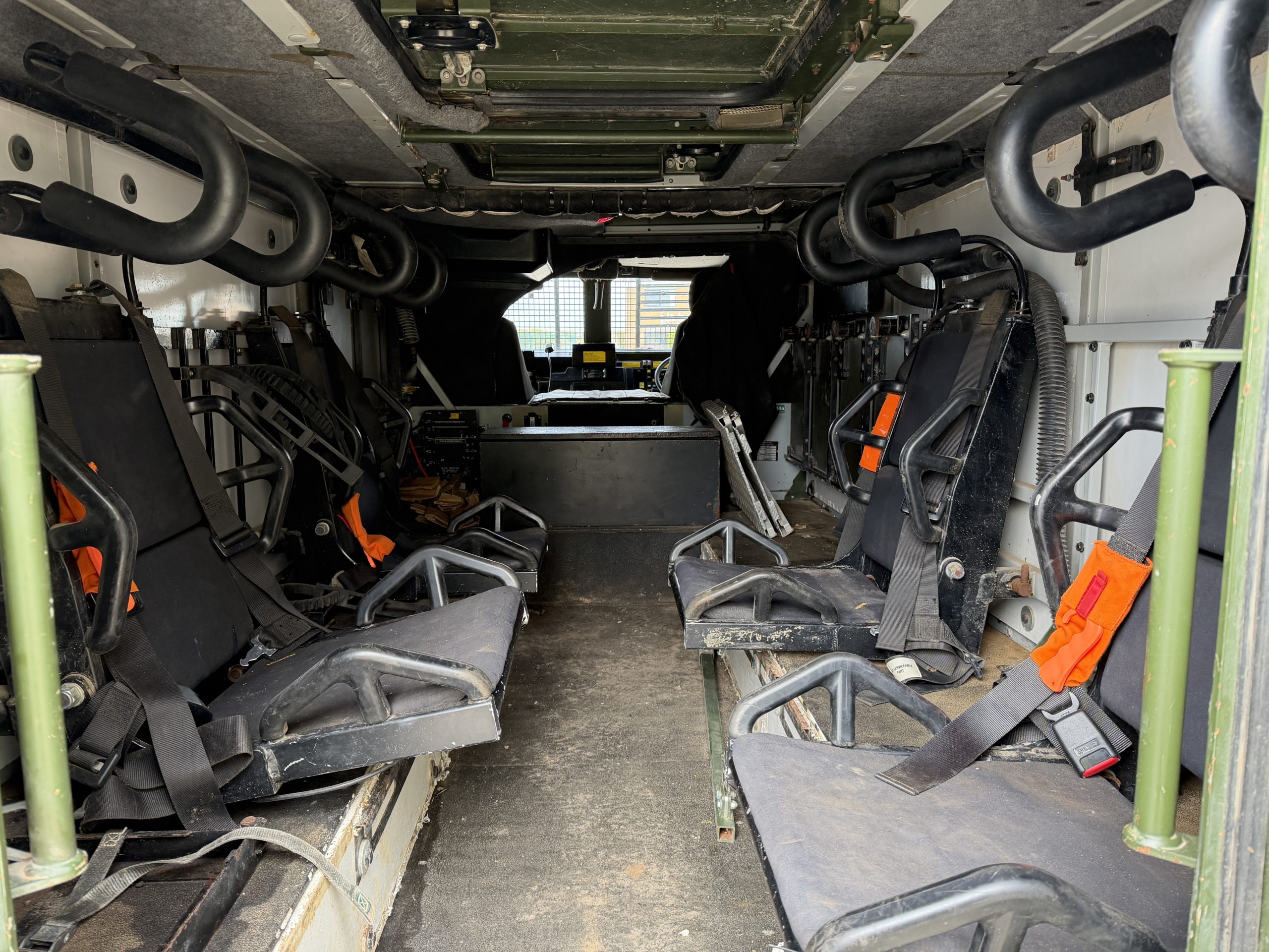 The troop compartment is at the rear and normally consists of four people who can rapidly enter and leave the vehicle via two doors in the rear of the vehicle. The seats are fitted with 4 point harness seat belts. Additional seating in the rear could be fitted if required